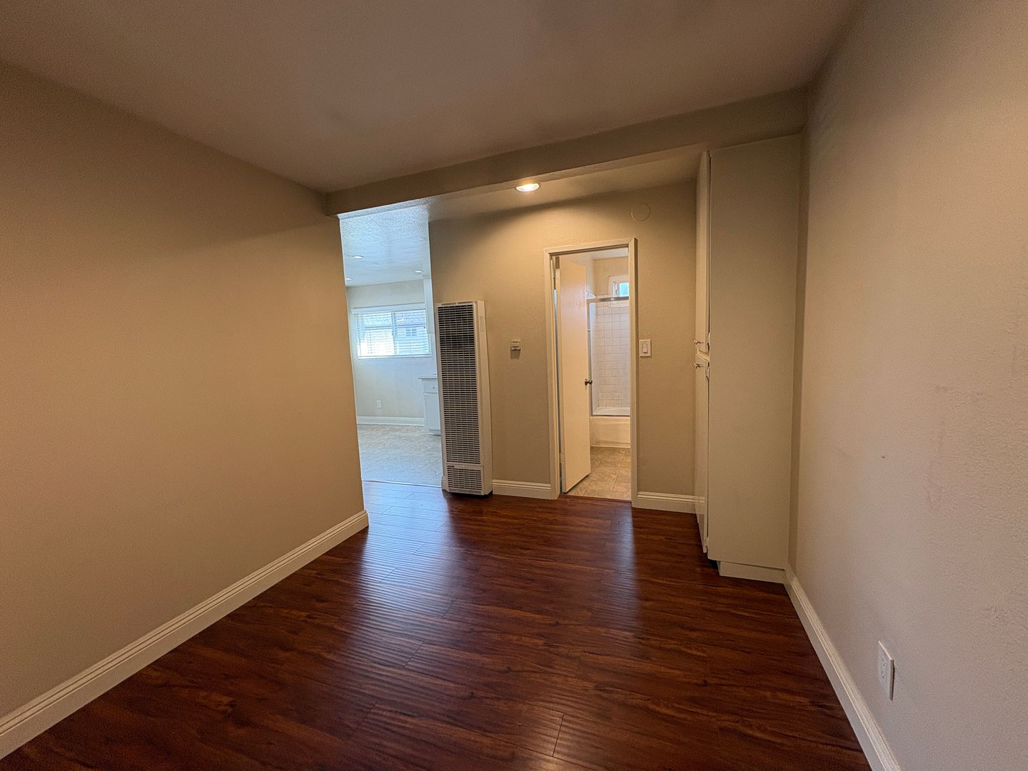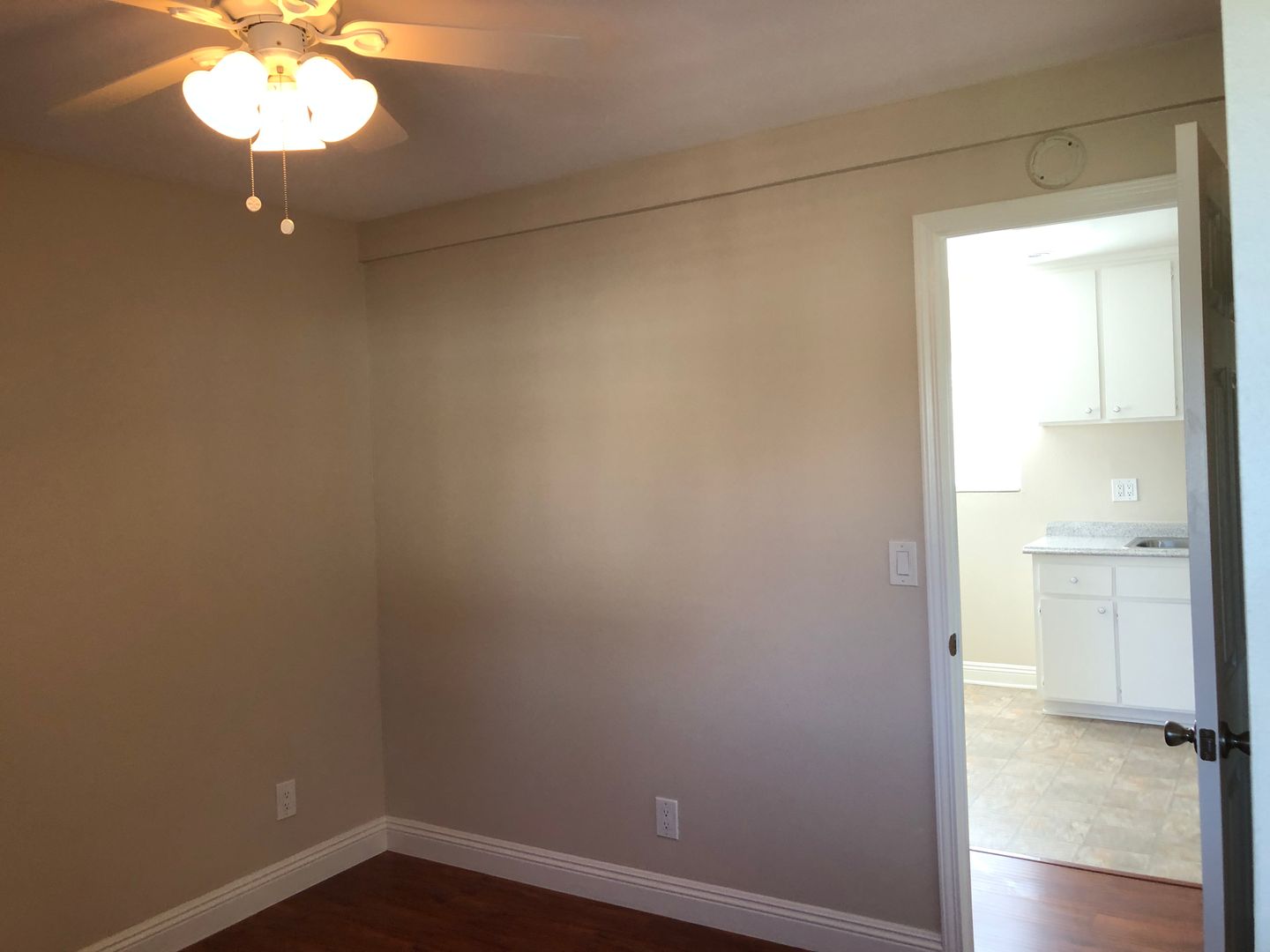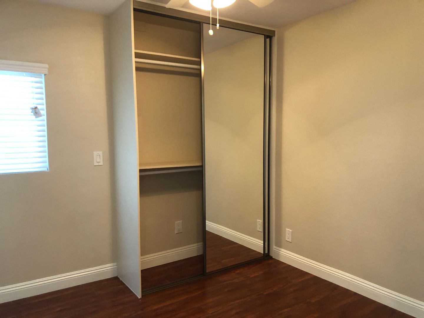 Bedroom has a new window & new horizontal blinds + ceiling fan