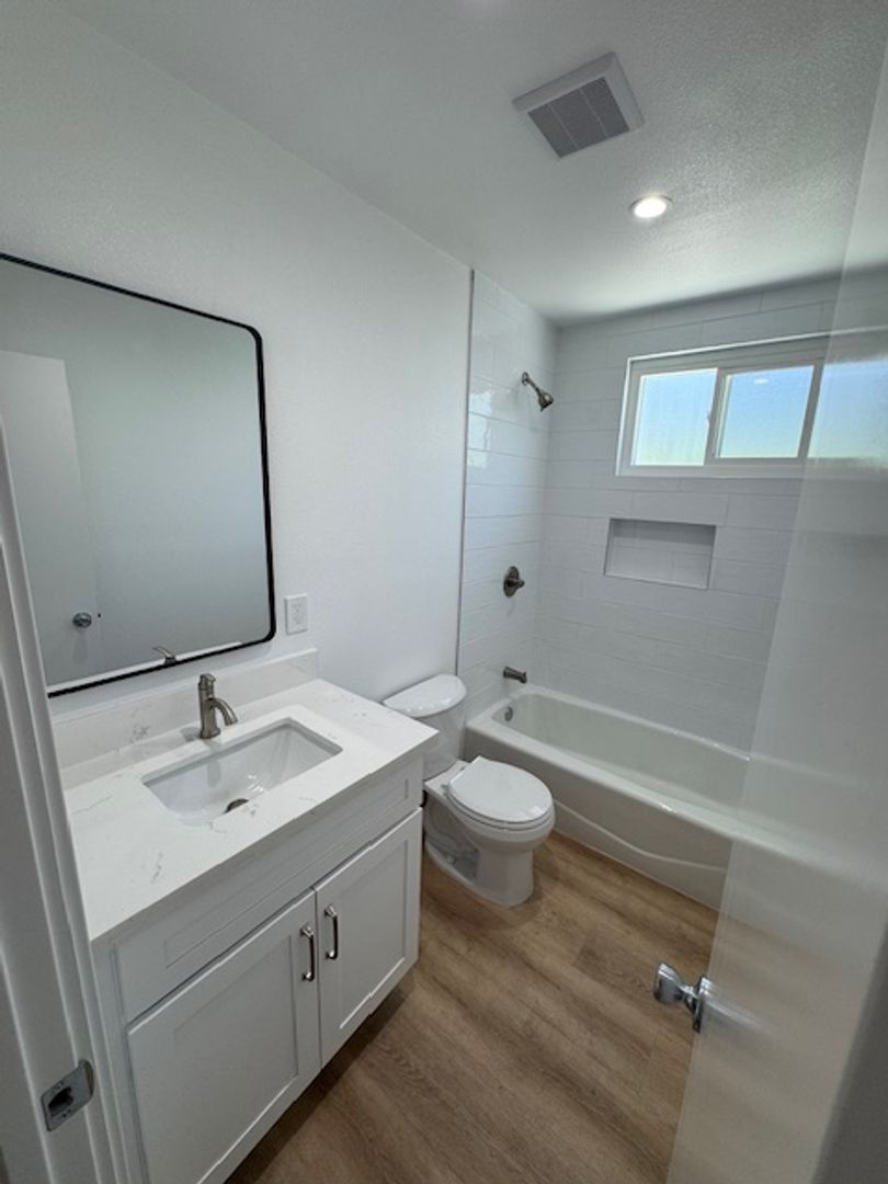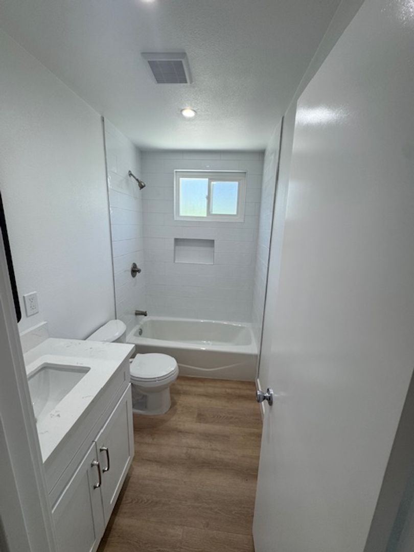 Remodeled bathroom with new tub, ceramic tile walls, updated plumbing, new vanity and toilet