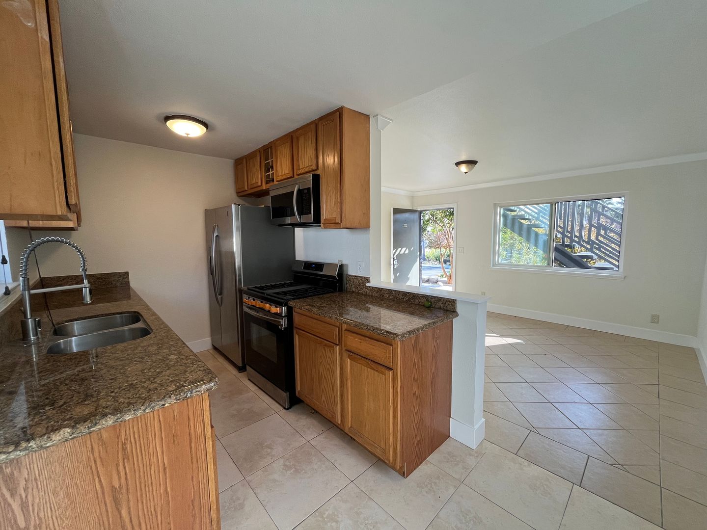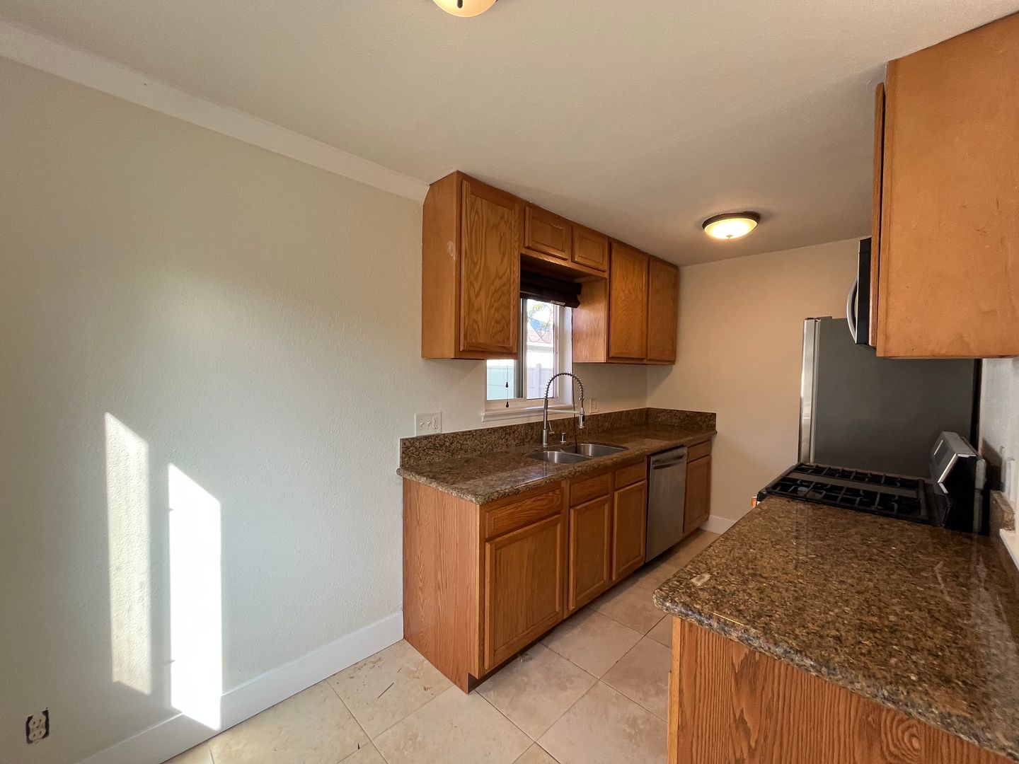Natural wood cabinets, granite counters, stainless steel appliances.