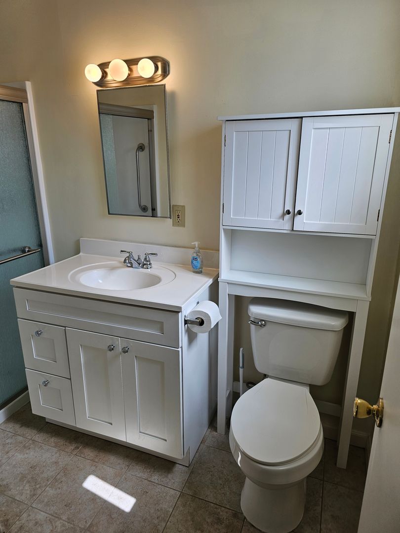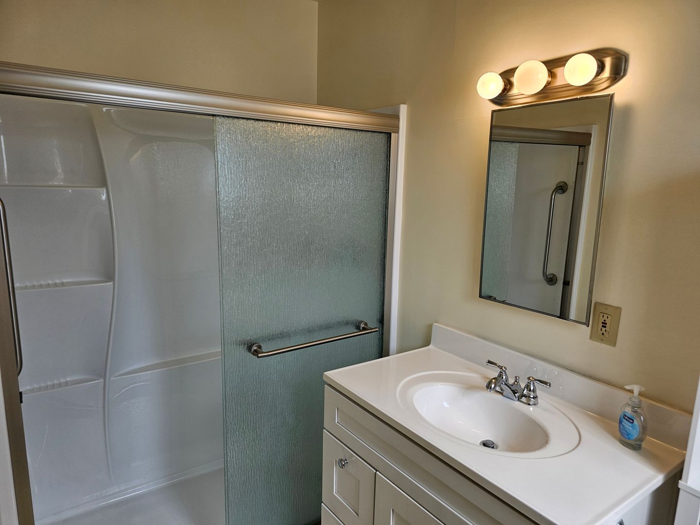 Newer bathroom. With newer vanity, mirror, new shower walls, tub, shower door.