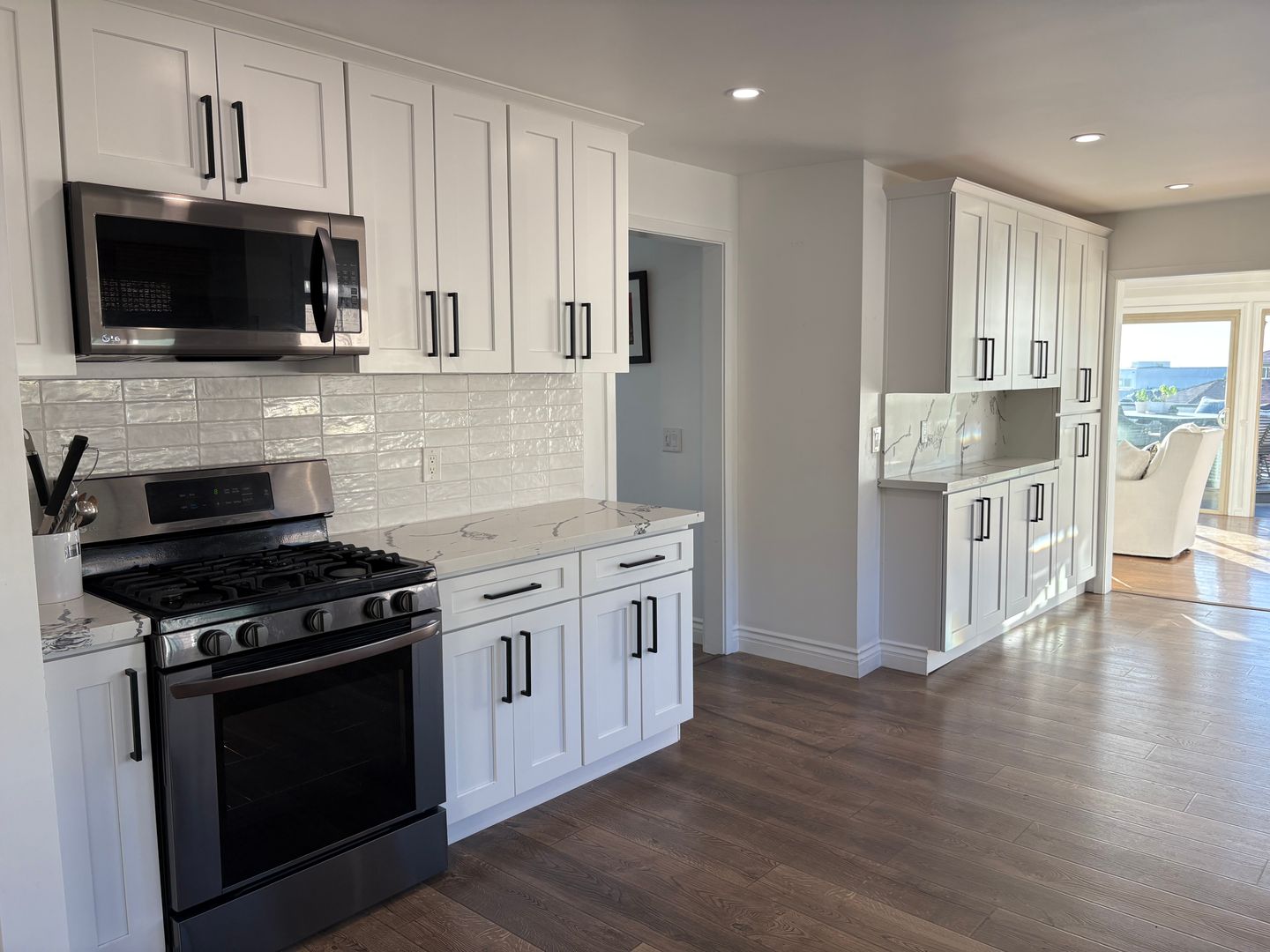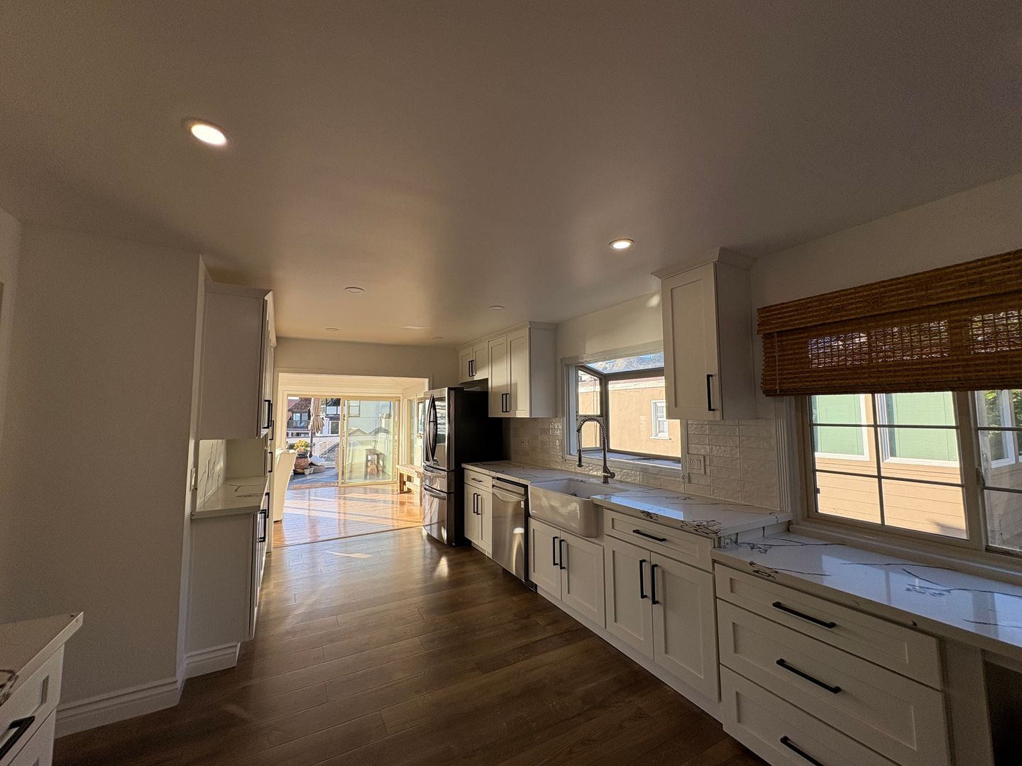 The unit features, hardwood floors and other solid flooring throughout, no carpeting.