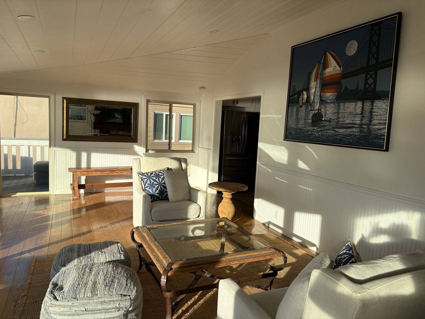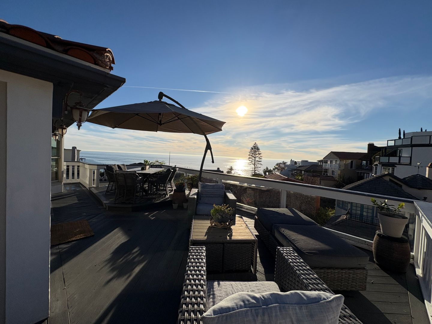 Glass walls facing the sunset and ocean views allow for an abundance of natural lighting in the living area. Vaulted ceilings are featured here too.