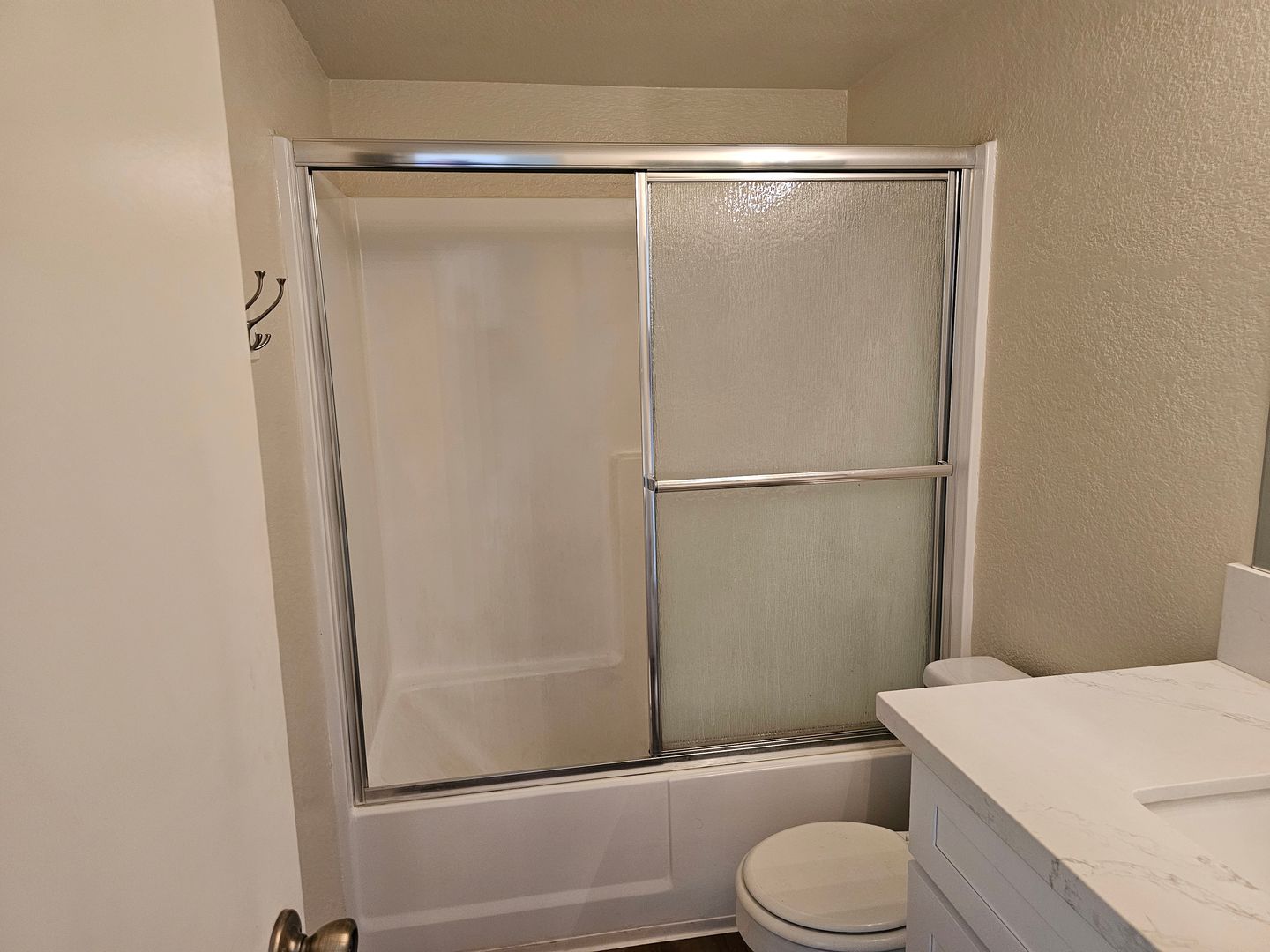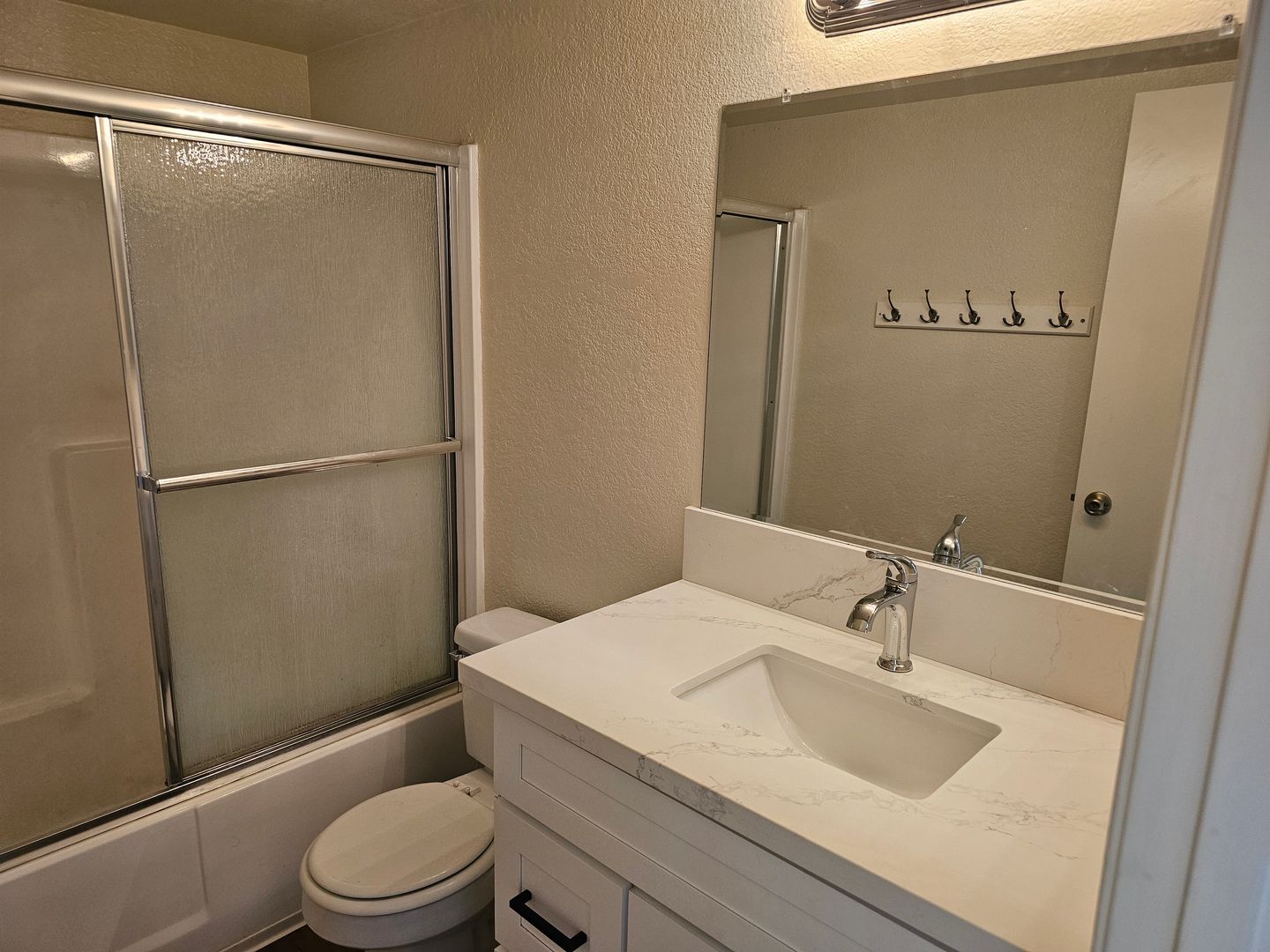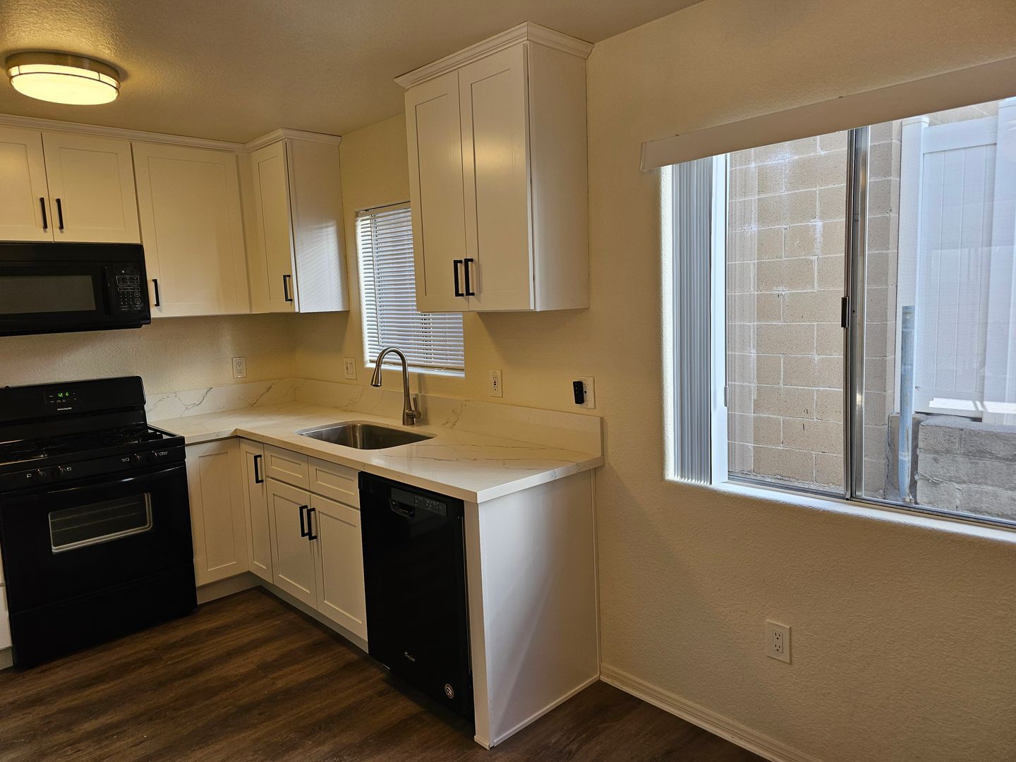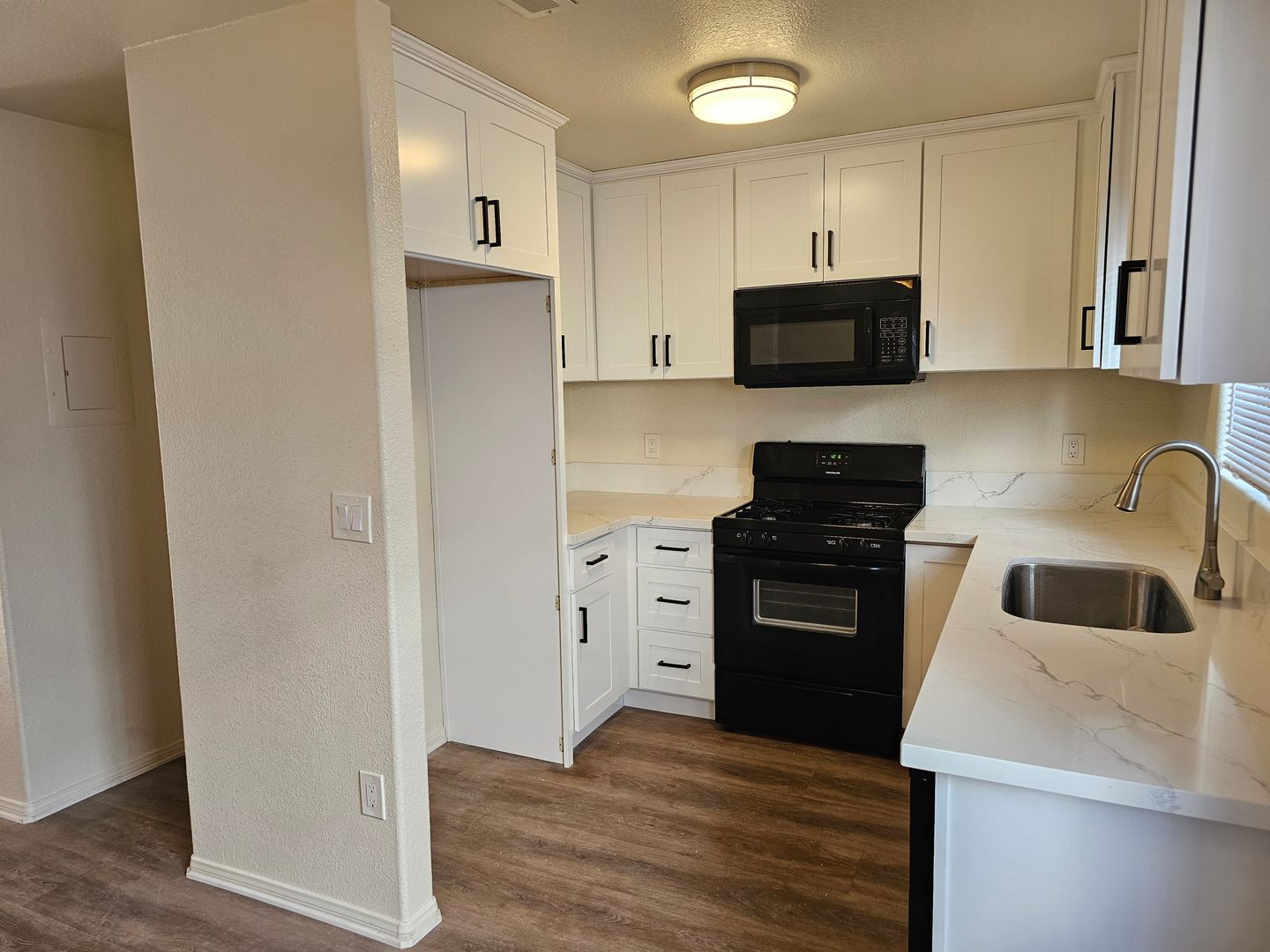 New kitchen! New white cabinets with new door pulls, new quartz countertop, new stainless steel sink, new faucet. Black appliances – gas stove, microwave, and dishwasher. Large pantry.
