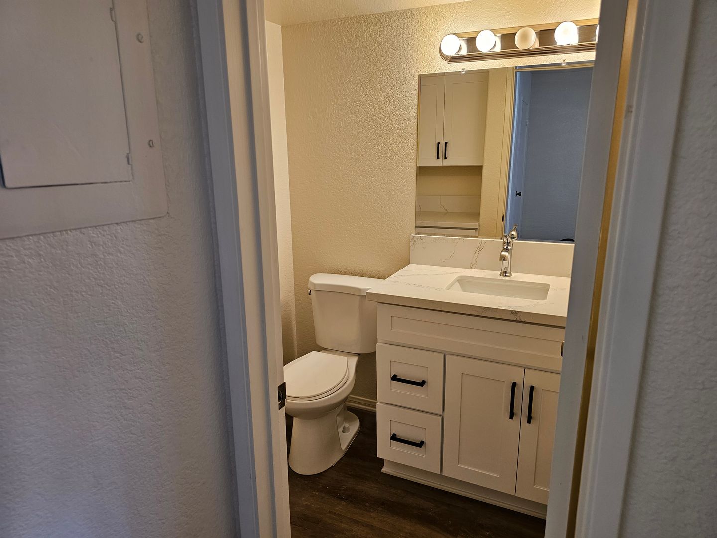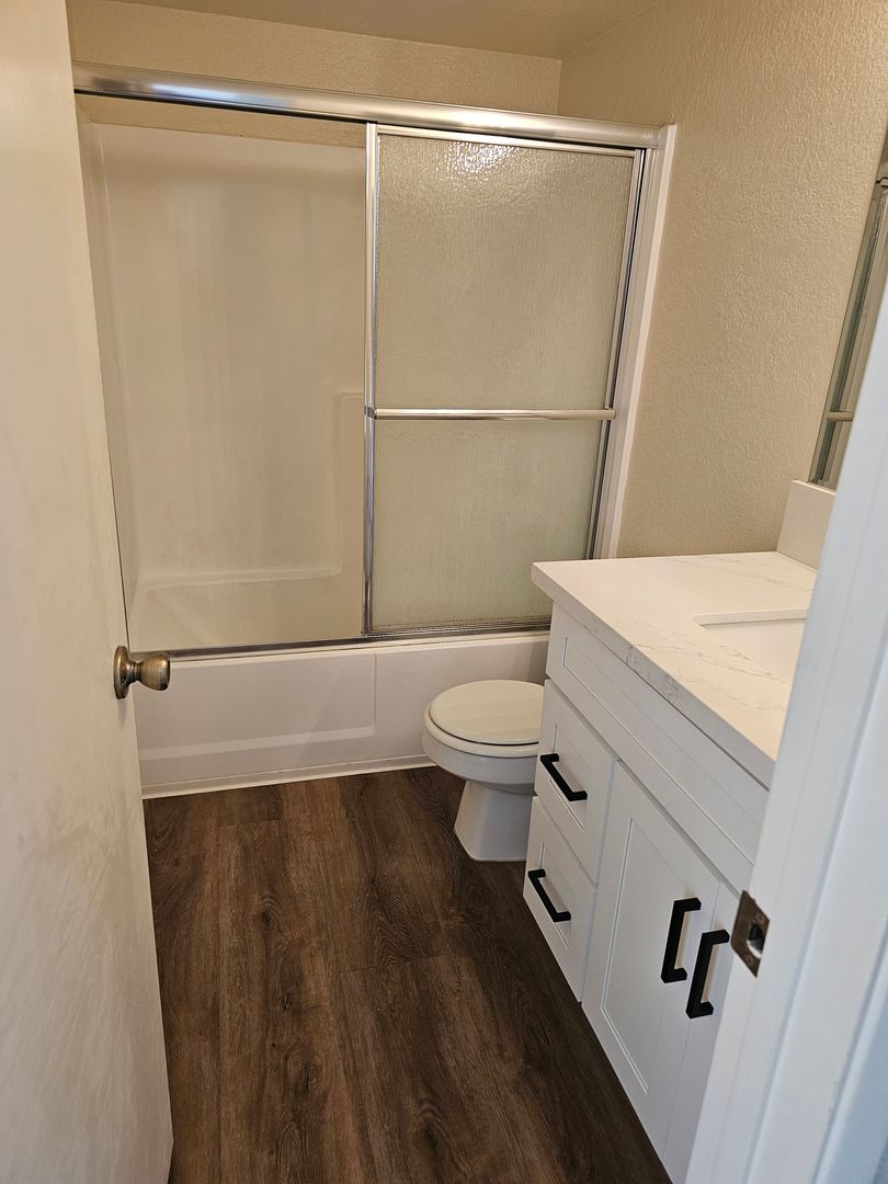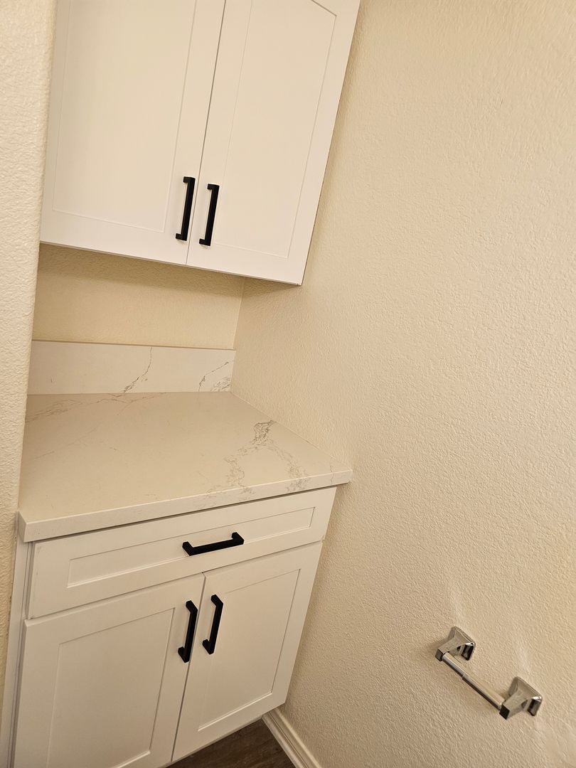 New bathrooms. The downstairs bathroom has new white cabinets, new door pulls, new white vanity, sink and faucet. One toilet. The upstairs bathroom has one toilet and shower/tub. New white vanity, door pulls, sink and faucet.