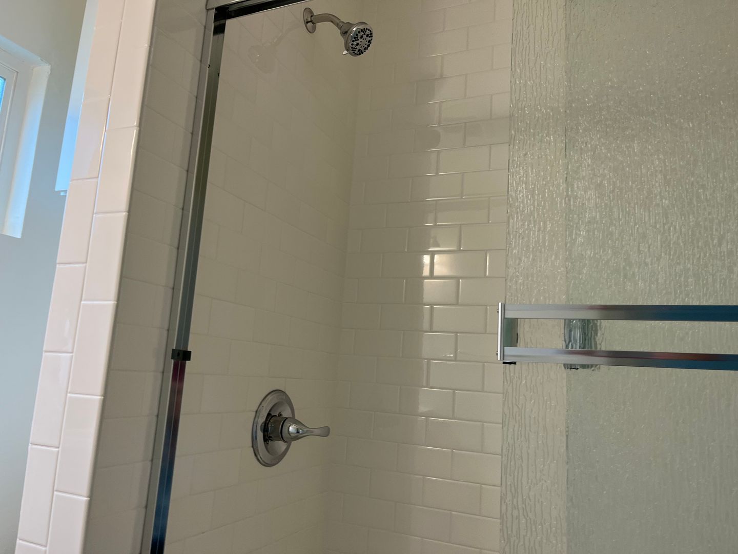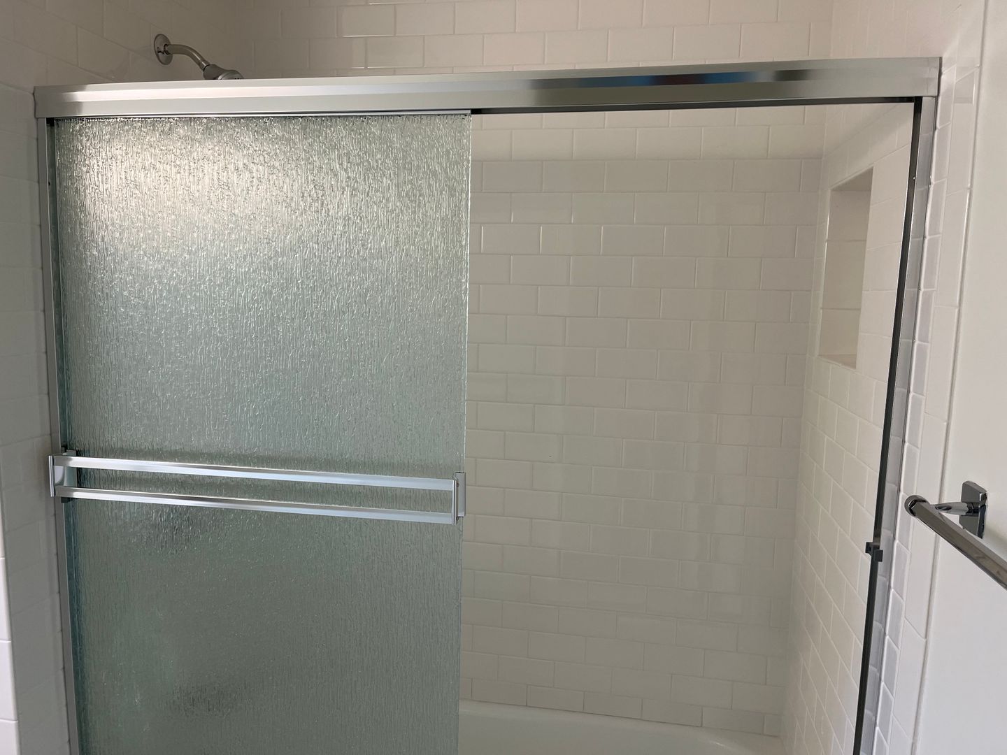 Newer tub and walls , with a nook for shampoo and conditioner